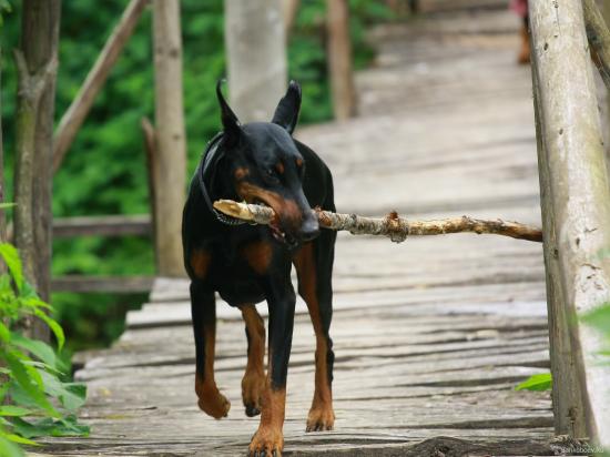 Обои Доберман играет с палкой