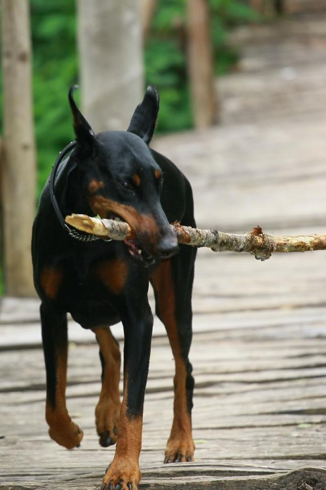 Обои Доберман играет с палкой