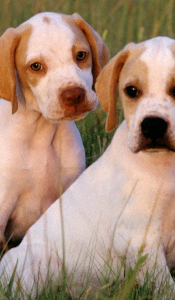 Обои Два щенка Пойнтер сидят на траве