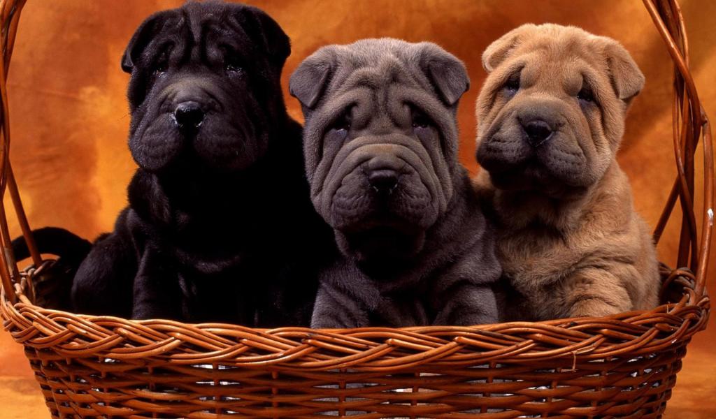 Обои Три щенка шарпей в корзине