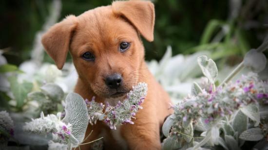 Обои Грустный щенок нюхает цветы