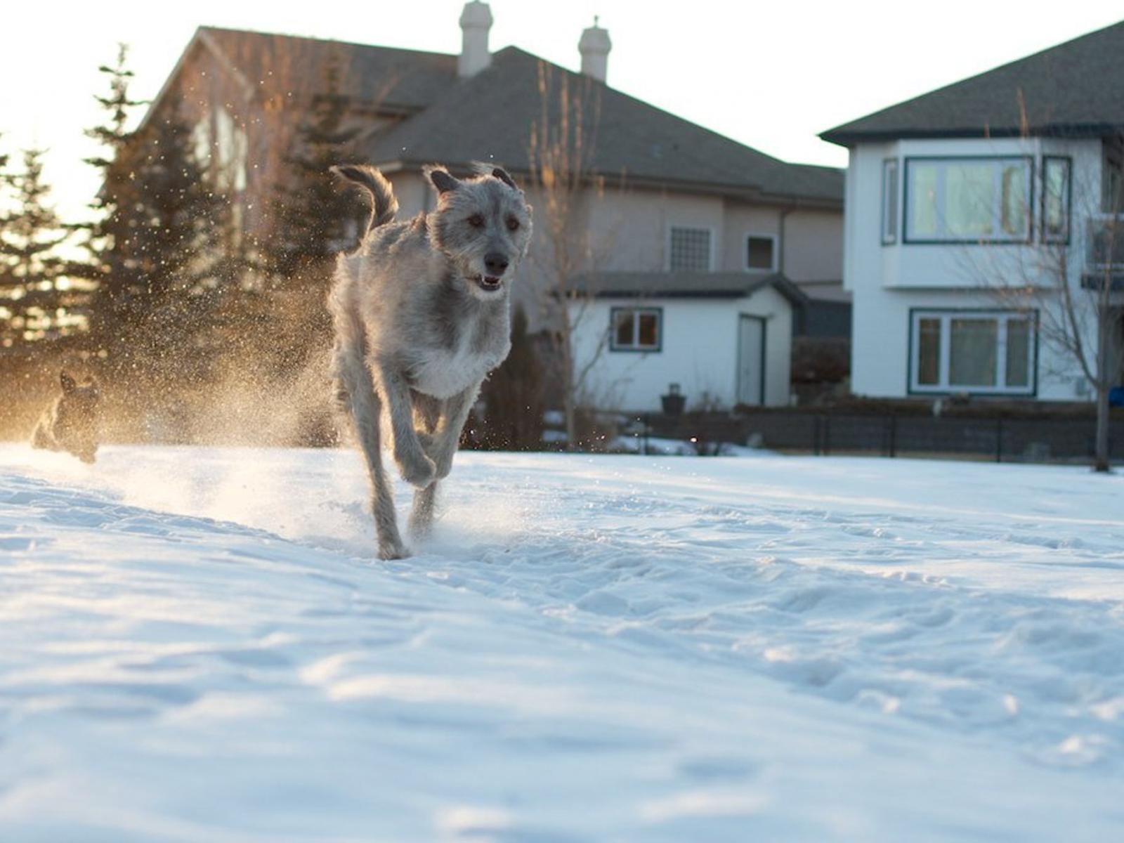 Обои Ирландский волкодав на фоне домов