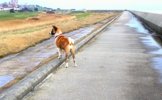 Обои Прогулка американской акиты у моря