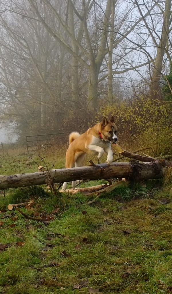 Обои Американская акита прыгает через препятствие