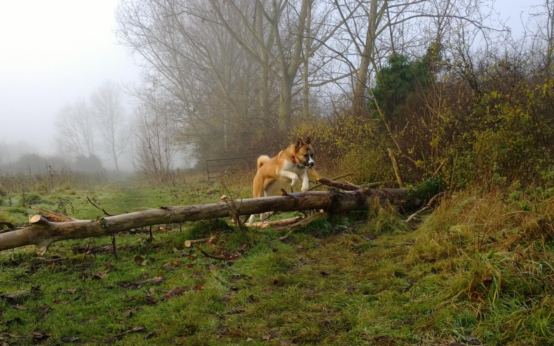 Обои Американская акита прыгает через препятствие