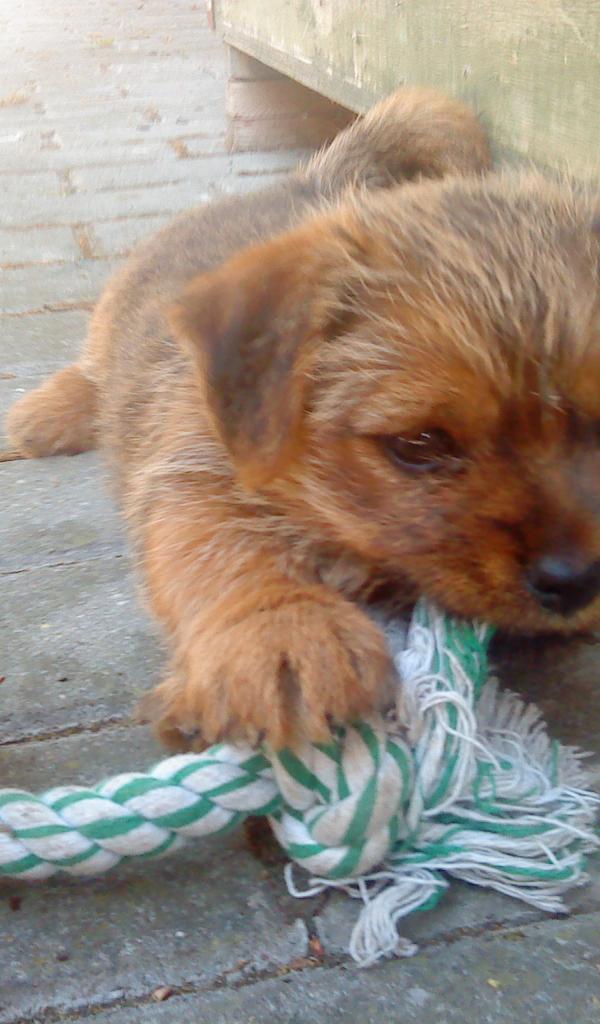 Обои Щенок норфолк терьер грызет игрушку