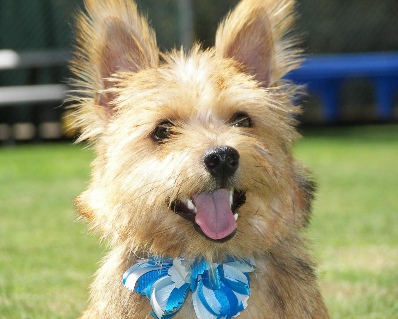 Обои Норфолк терьер с голубым бантом