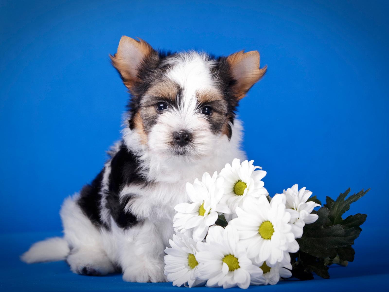 Обои Щенок бивер йорк с букетом