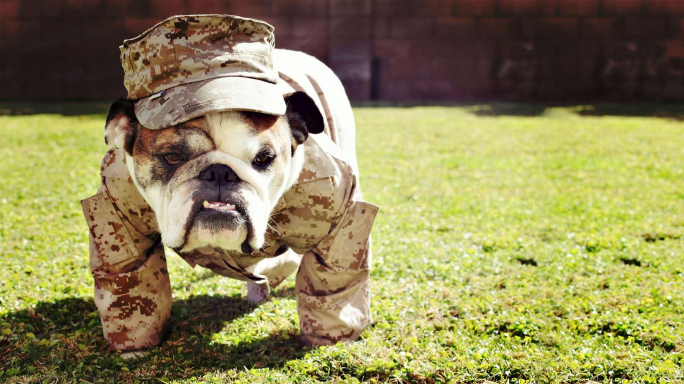 Обои Английский бульдог в военной форме