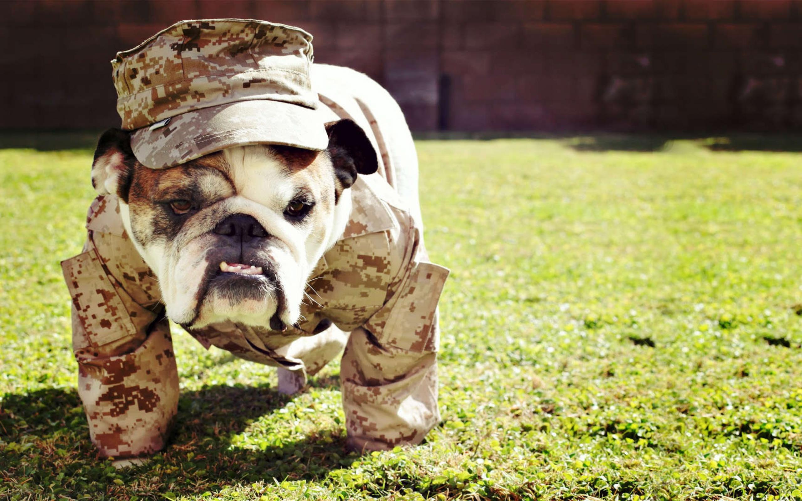 Обои Английский бульдог в военной форме