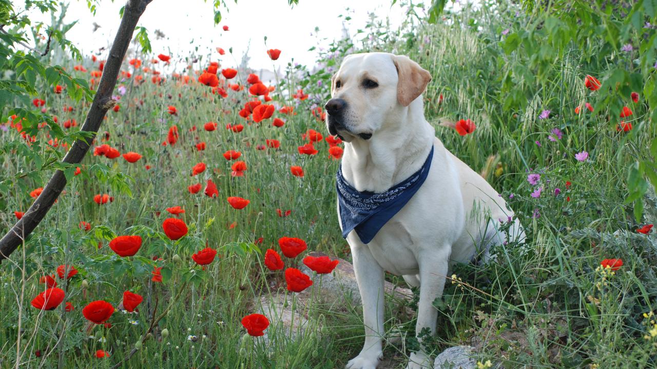 Обои Лабрадор среди цветов