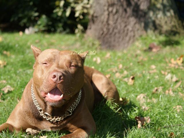 Обои Довольный питбуль на траве