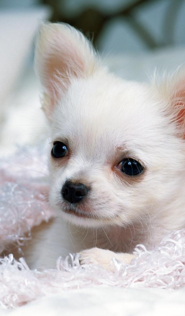 Обои Щенок породы бишон-фриз лежит на белой постели