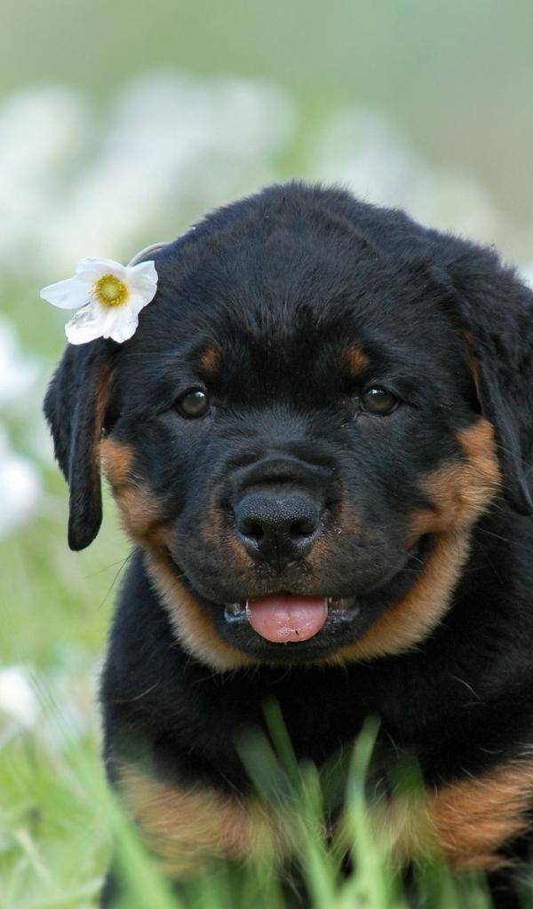 Обои Щенок ротвейлера с цветком