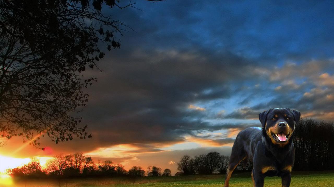 Обои Ротвейлер на фоне заката