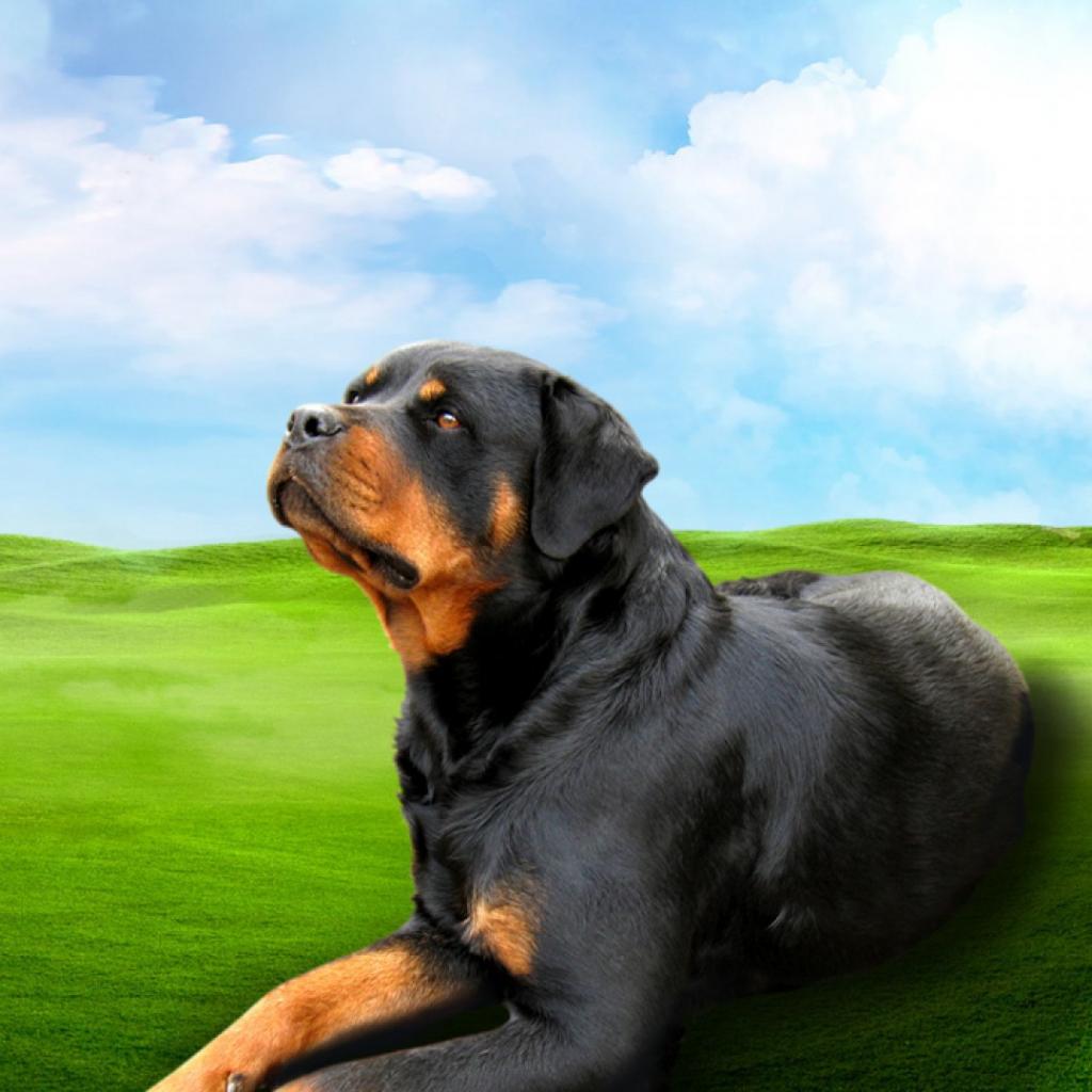 Обои Ротвейлер на зеленом поле