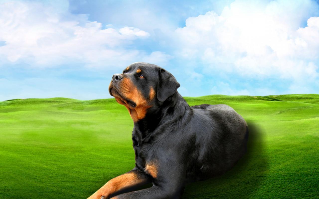 Обои Ротвейлер на зеленом поле