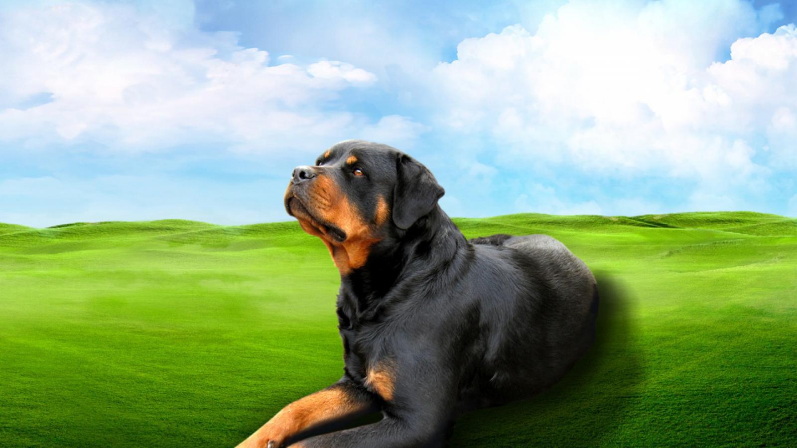 Обои Ротвейлер на зеленом поле