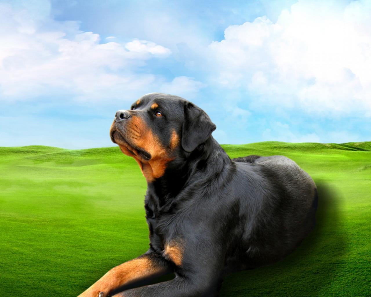 Обои Ротвейлер на зеленом поле