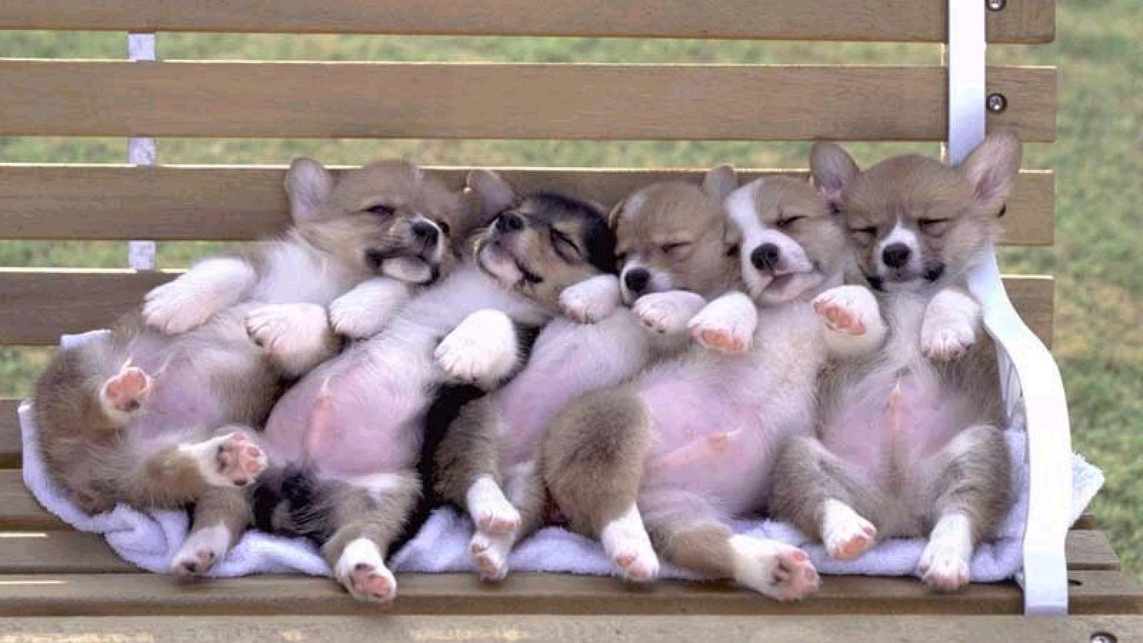 Обои Щенки вельш-корги спят на лавке