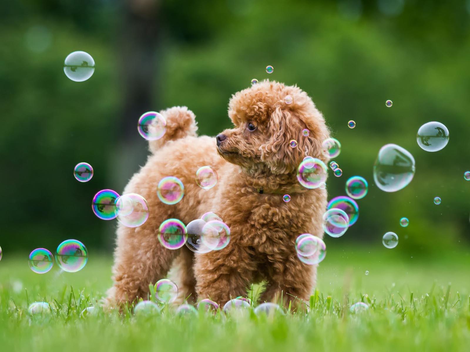 Обои Пудель среди мыльных пузырей