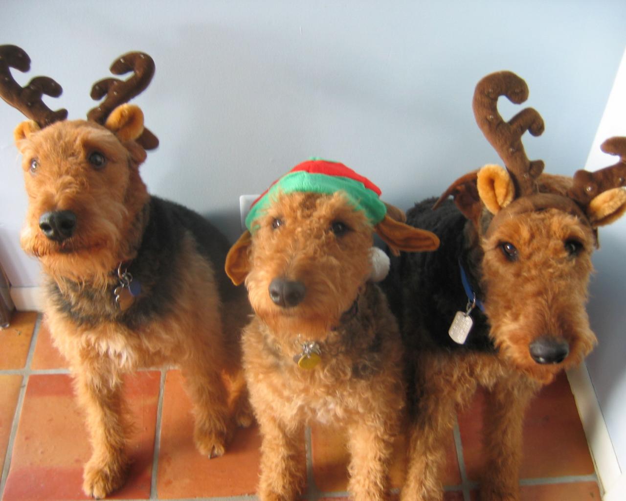 Обои Тройка рождественских эрдельтерьеров