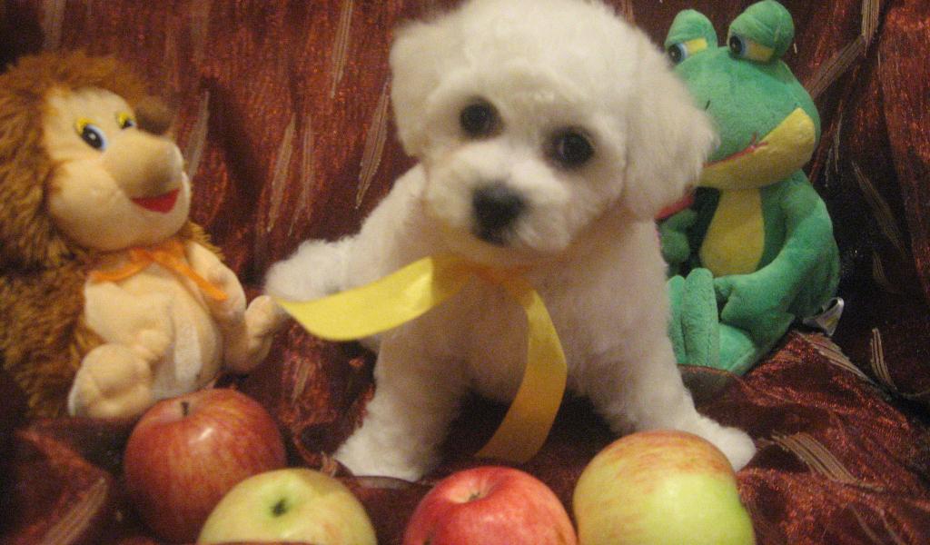 Обои Болонка среди игрушек