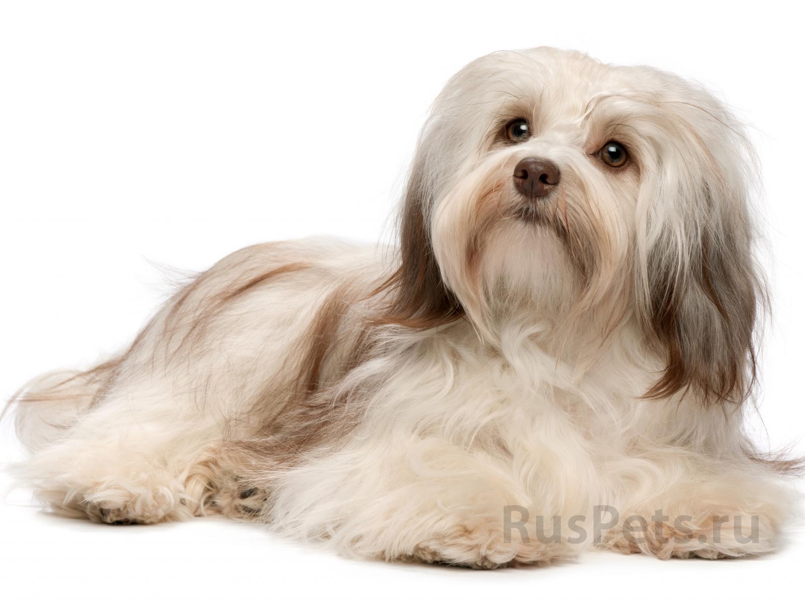 Обои Собака породы бишон-фриз лежит на лужайке с мячом