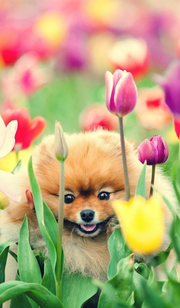 » Обои Шпиц среди тюльпанов