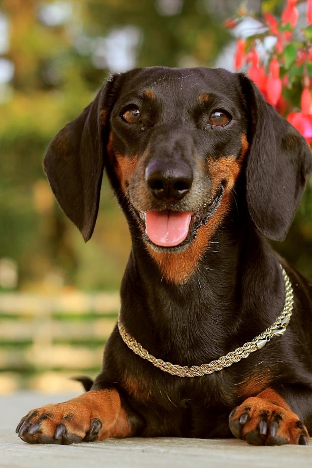 Обои Такса лежит у цветка