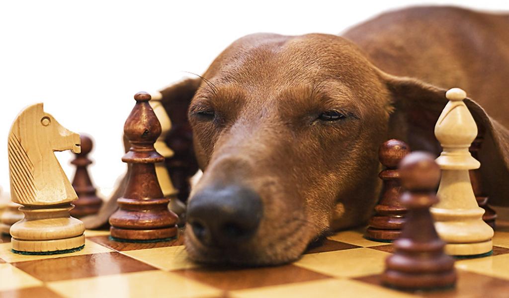 Обои Такса спит среди шахмат