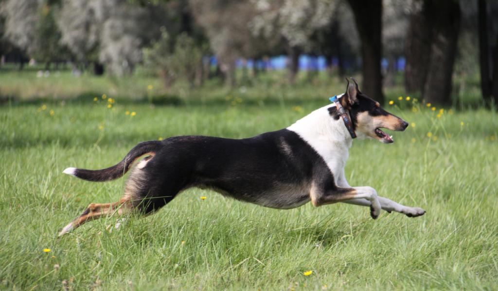 Обои Счастливая бордер-колли бежит по цветочной поляне