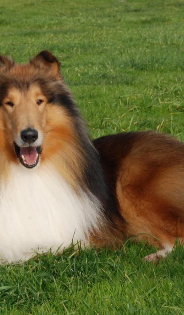 Обои Пушистая колли отдыхает на газоне