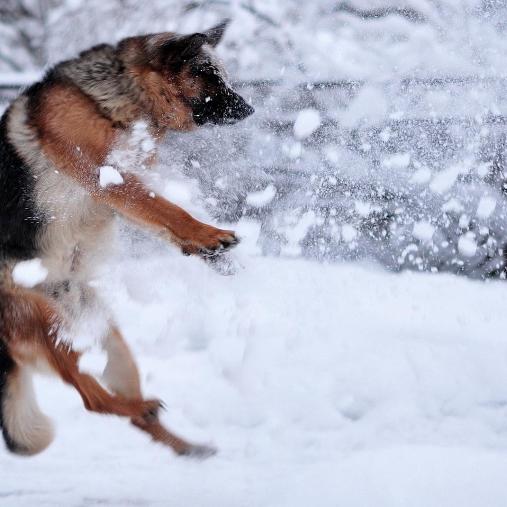 Обои Немецкая овчарка ловит снежки