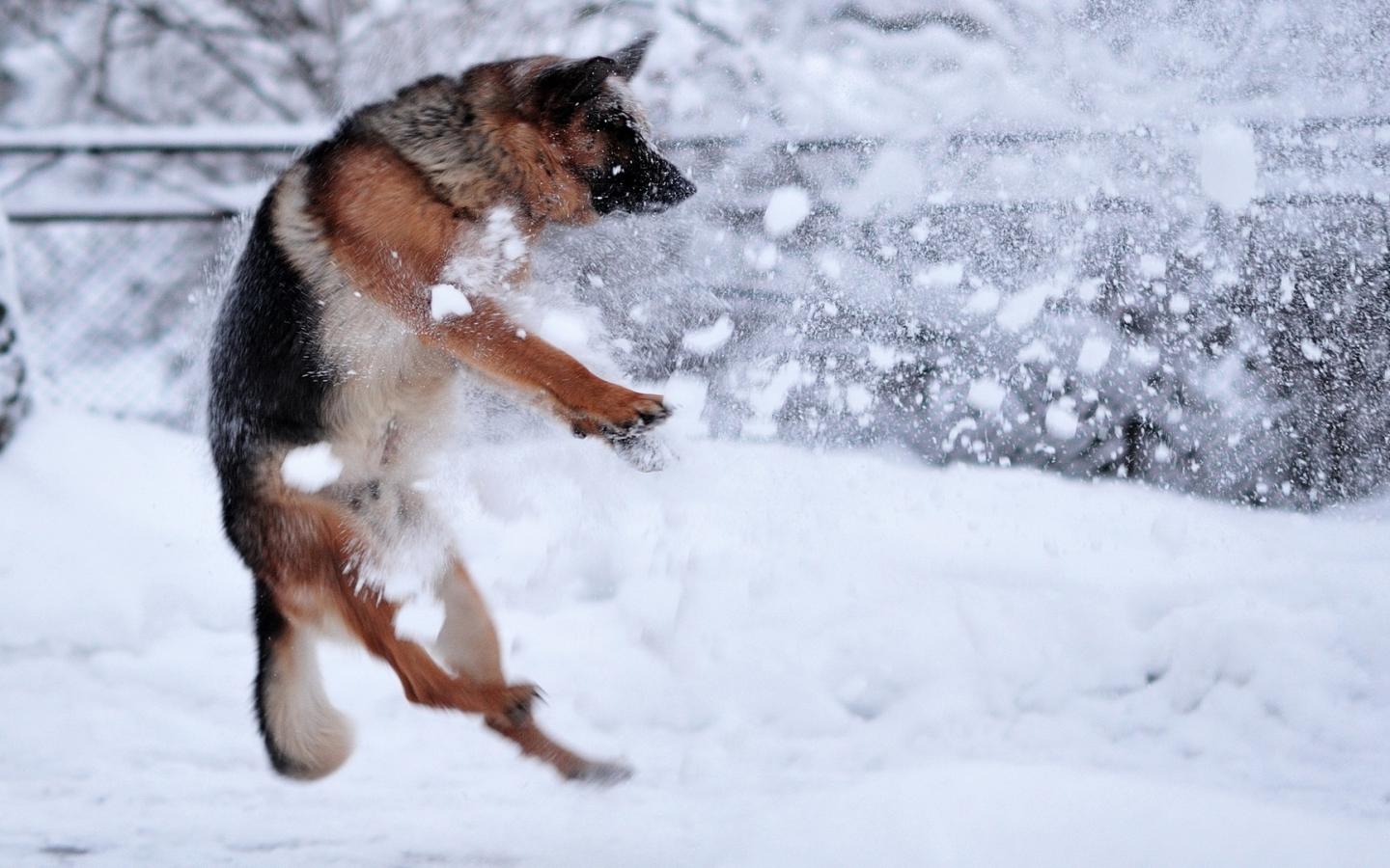 Обои Немецкая овчарка ловит снежки