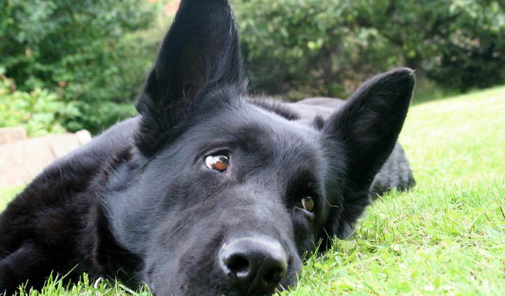 Обои Черная немецкая овчарка лежит на траве