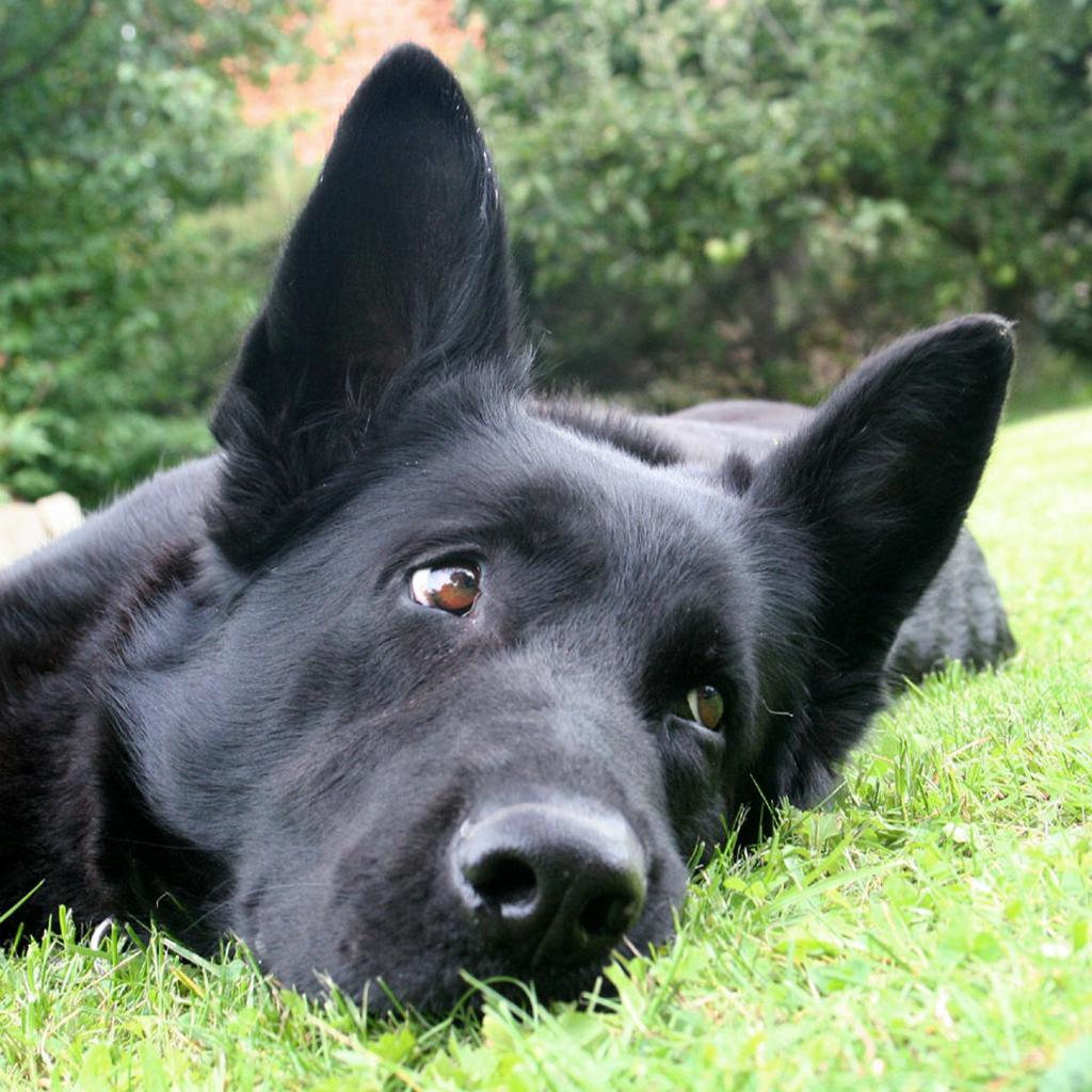 Обои Черная немецкая овчарка лежит на траве