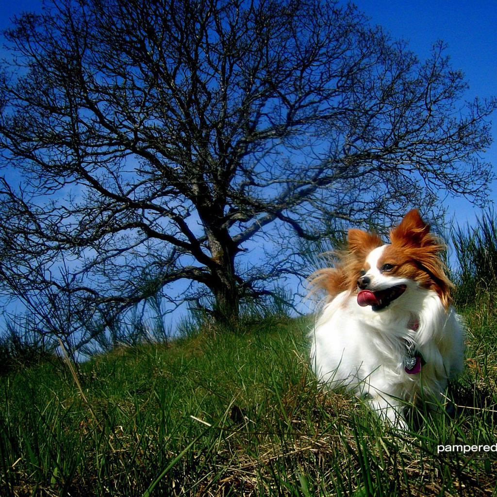 » Обои Папильон играет у дерева
