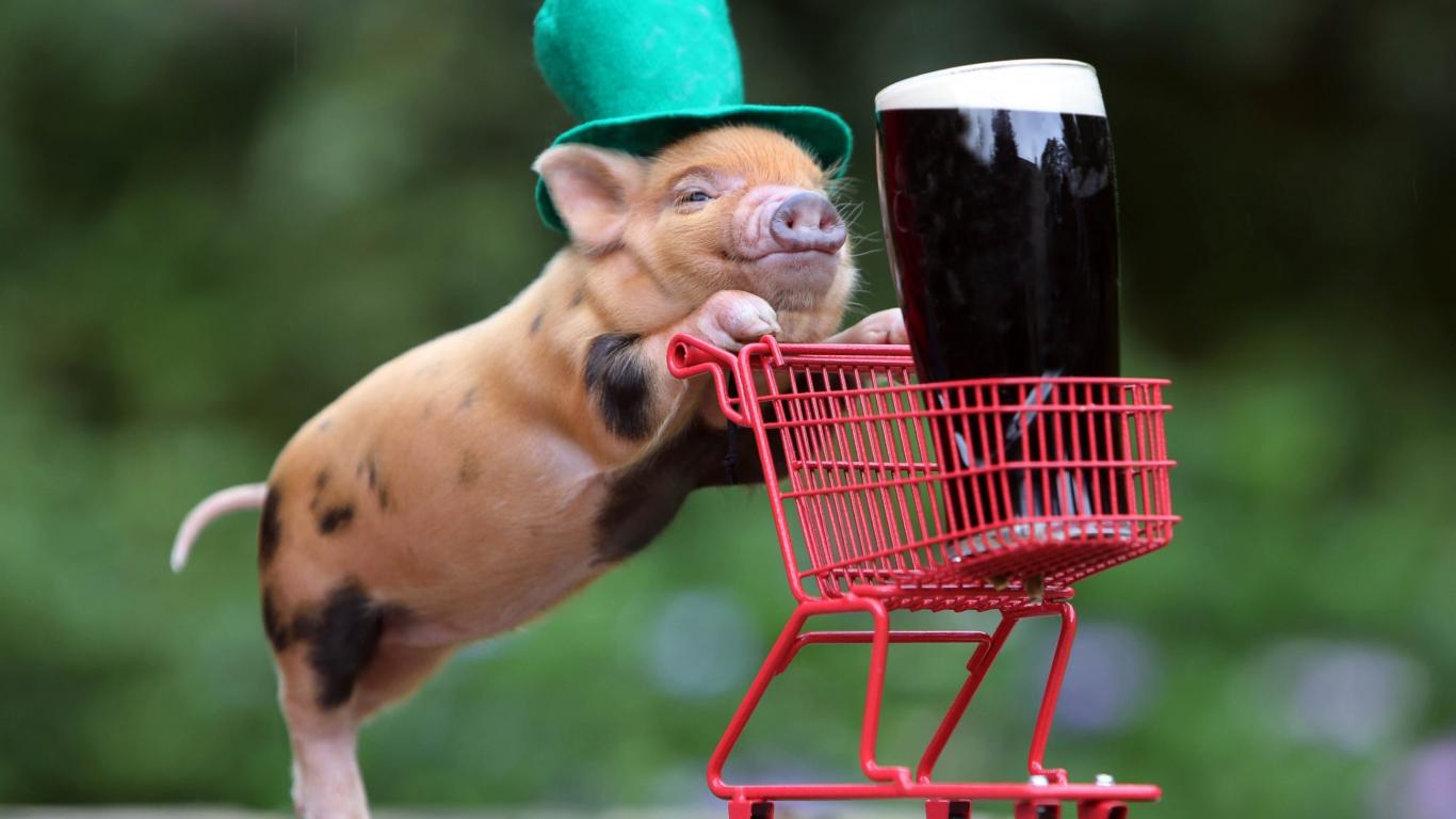 Обои Дрессированная свинья везет корзинку