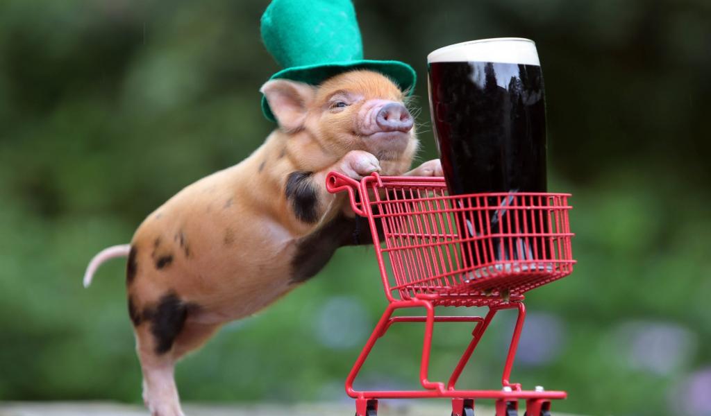 Обои Дрессированная свинья везет корзинку