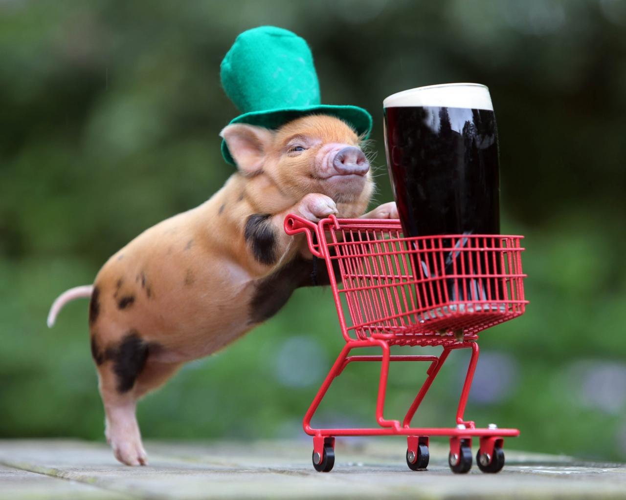 Обои Дрессированная свинья везет корзинку