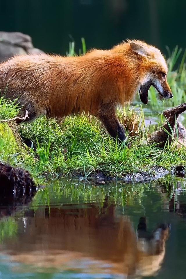 Обои Лиса играет с детенышем у воды