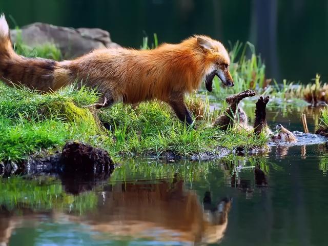 Обои Лиса играет с детенышем у воды