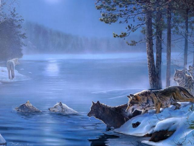 Обои Волки переплывают реку