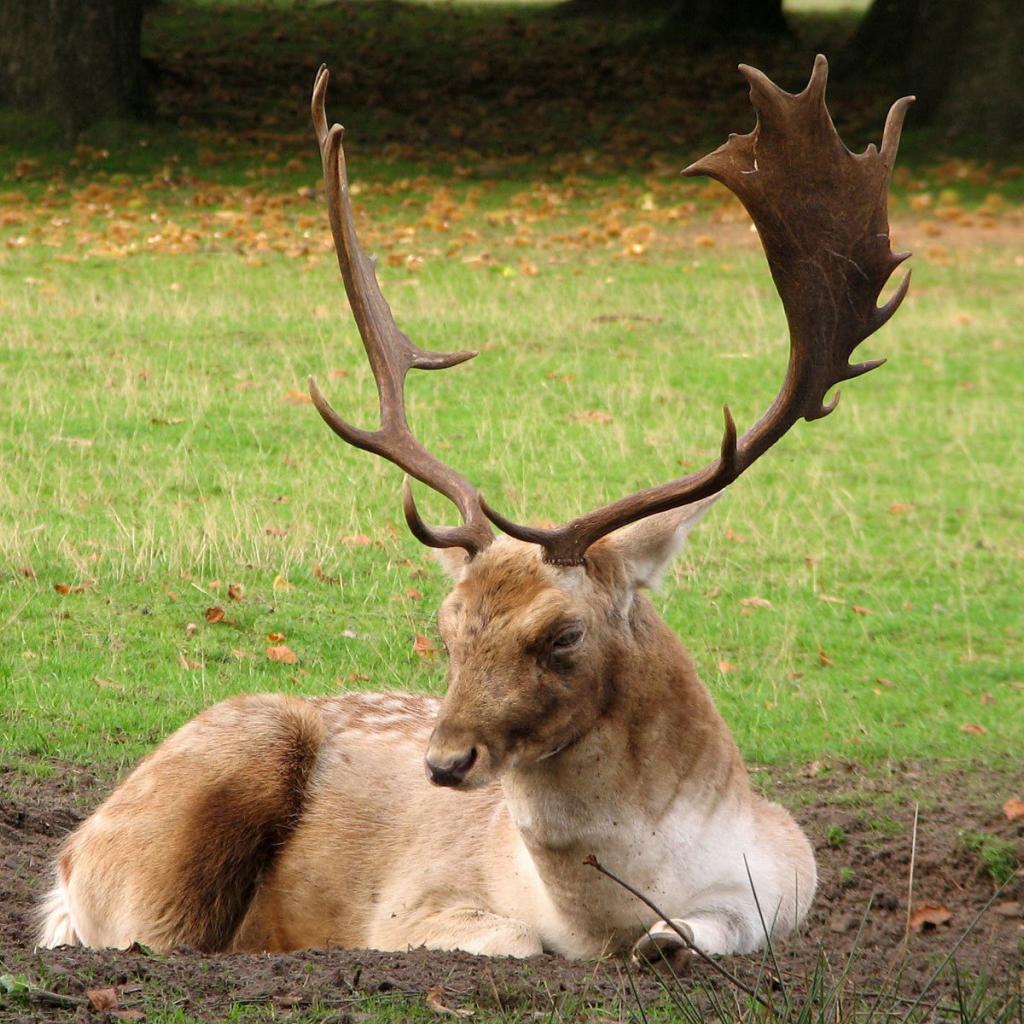 Обои Олень с большими рогами лежит на земле