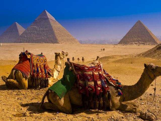 Обои Верблюды отдыхают на фоне пирамид