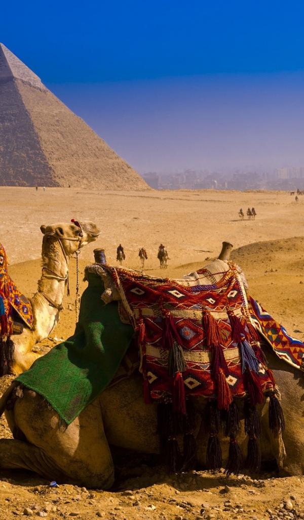Обои Верблюды отдыхают на фоне пирамид