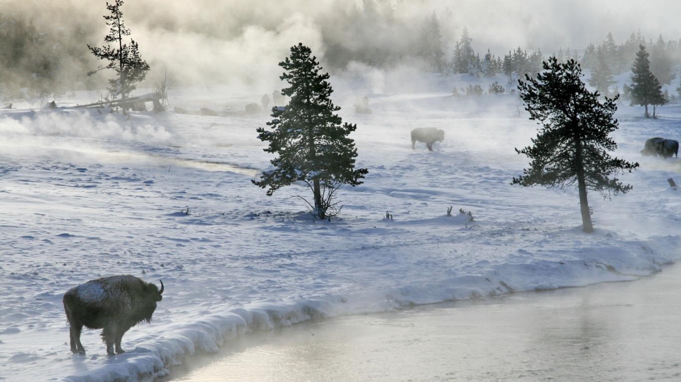 Обои Бизоны пасутся на снегу