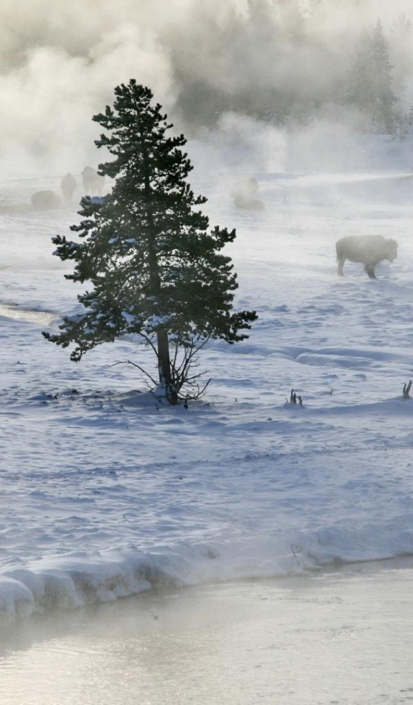 Обои Бизоны пасутся на снегу