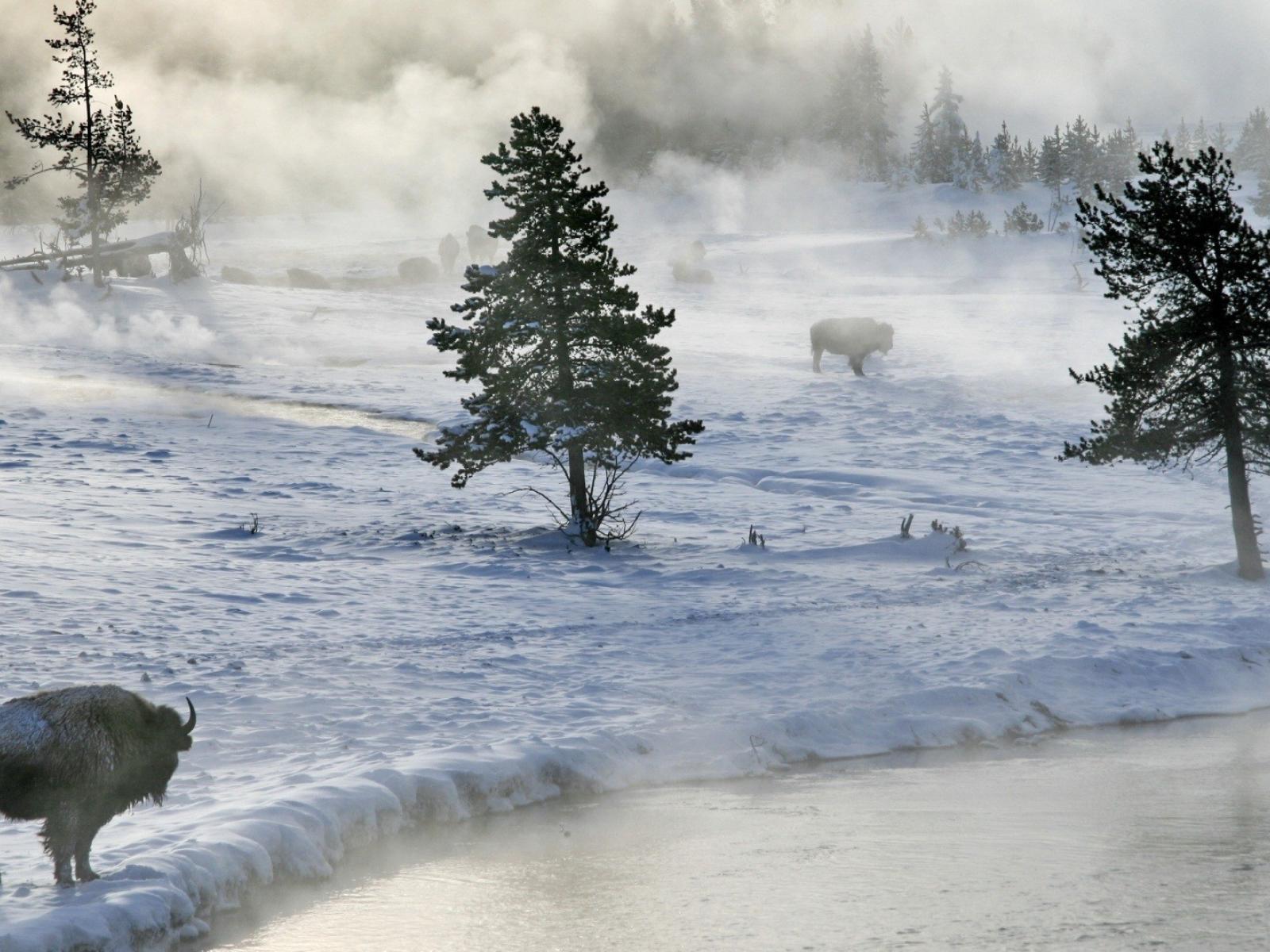 Обои Бизоны пасутся на снегу